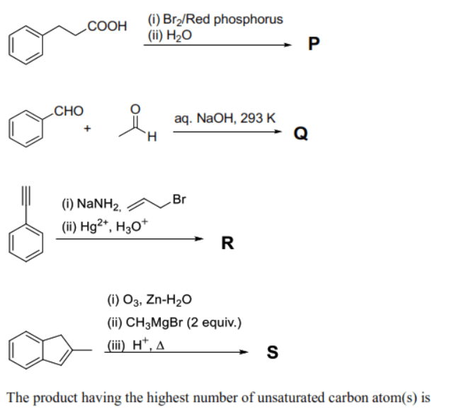 In reaction 1, 3-phenylpropanoic acid undergoes the Hell-Volhard-Zelinsky (HVZ) reaction to produce 2-bromo-3-phenylpropanoic acid (). The unsaturated carbons include the 6 carbons of the benzene ring and the 1 carbon of the carboxylic acid carbonyl, totaling 7.