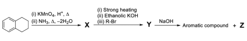 - Step 1 (Formation of X): Tetralin undergoes vigorous oxidation with acidic to form Phthalic acid (benzene-1,2-dicarboxylic acid). When phthalic acid is treated with and heated (), it forms Phthalamide (). (Note: The explicit loss of indicates the formation of phthalamide).